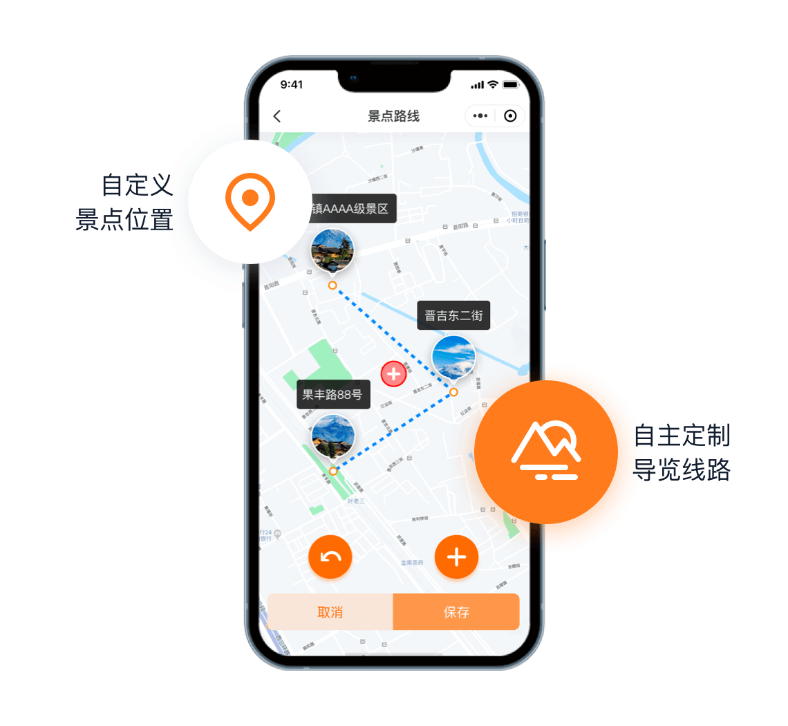 可自定义景点位置、绘制游览路线、编辑景点攻略,轻松构建差异化景区导览内容。