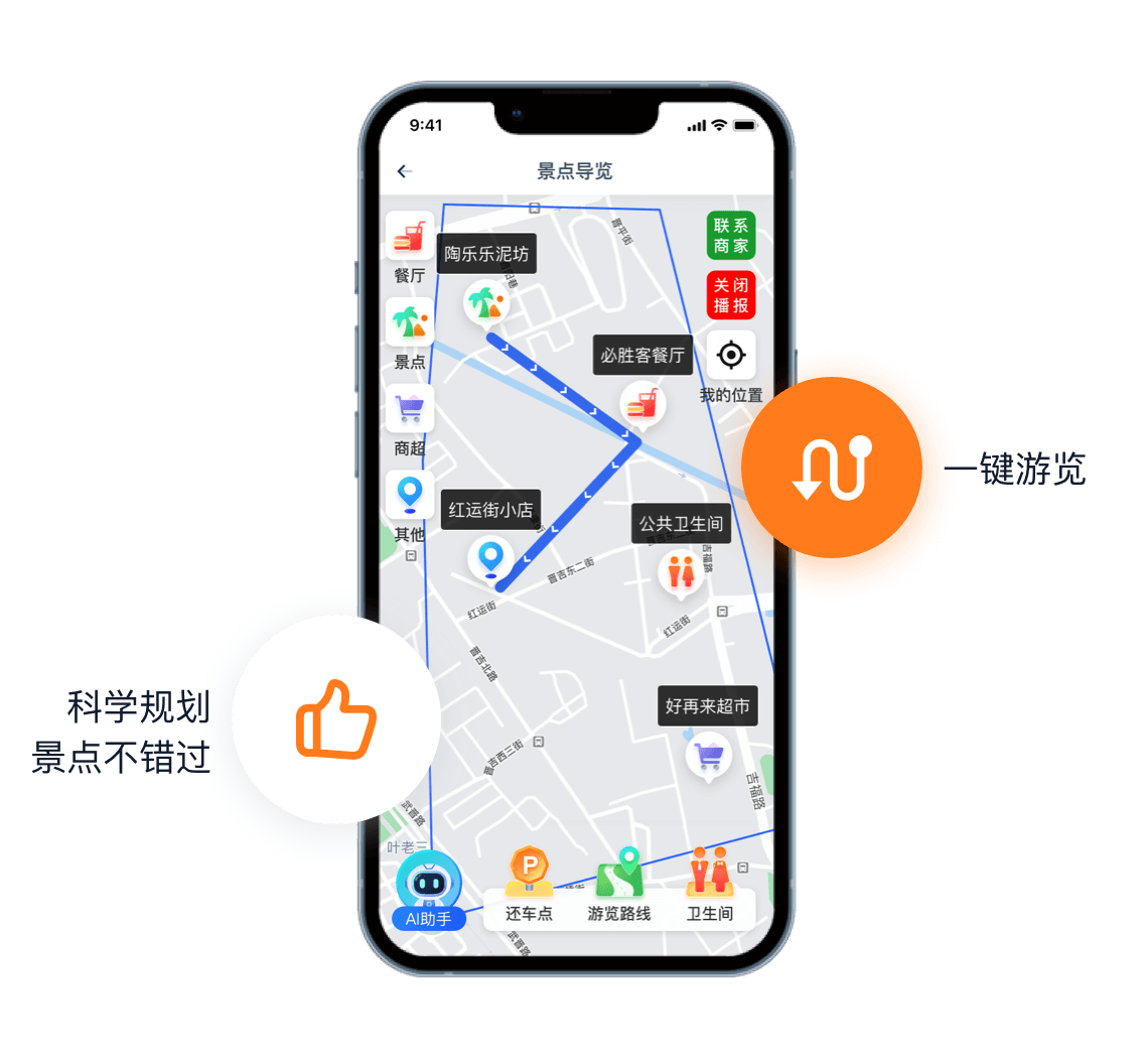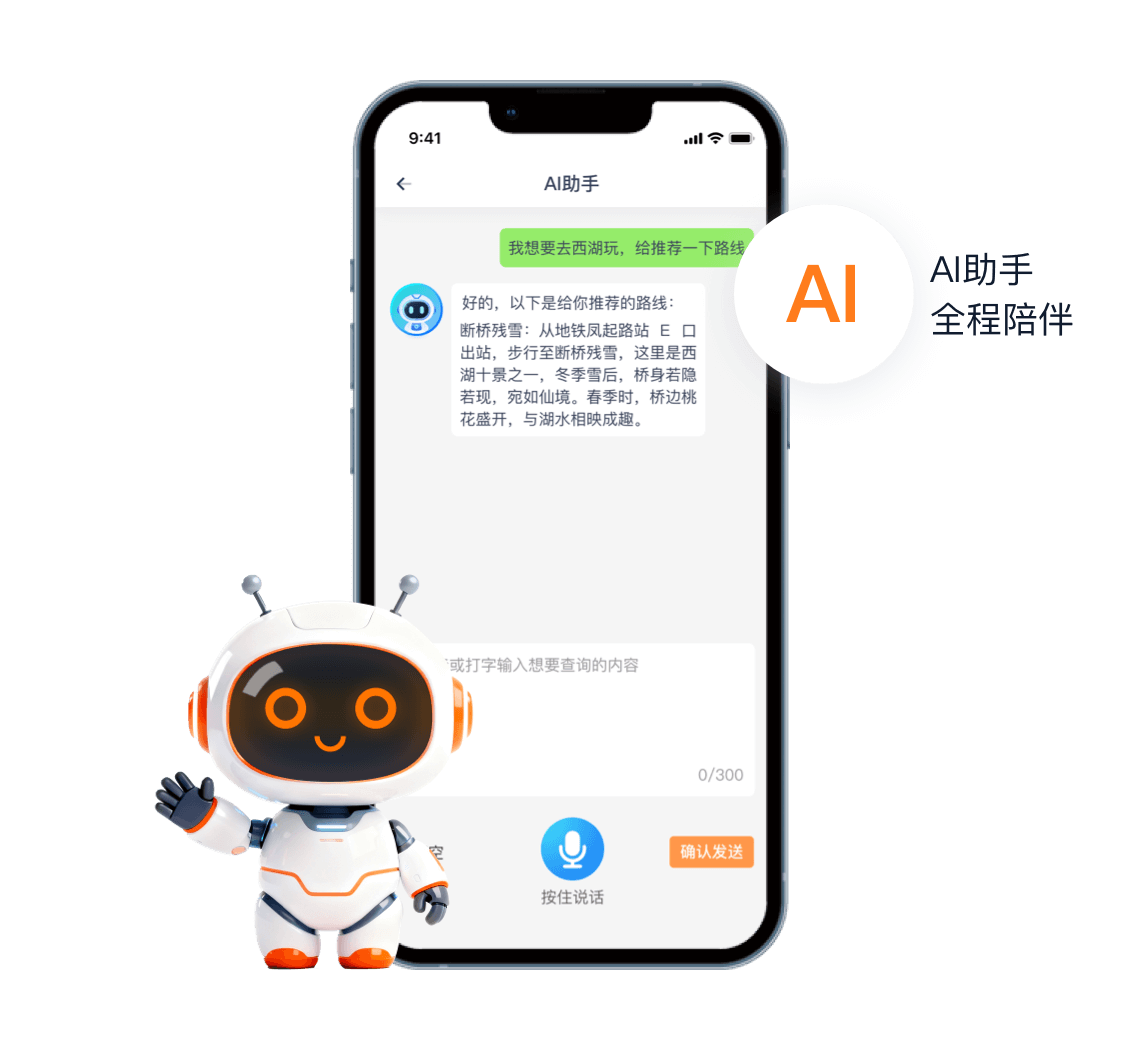 导览页内置 AI 助手,游玩、租车相关问题随时问,游玩助手全程陪伴。