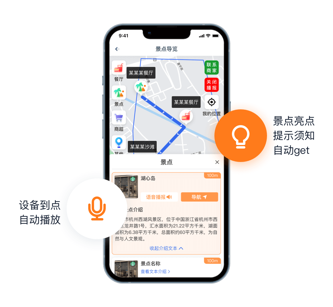 设备到点自动播报,商家可自定义内容,介绍景点亮点、提示须知等。