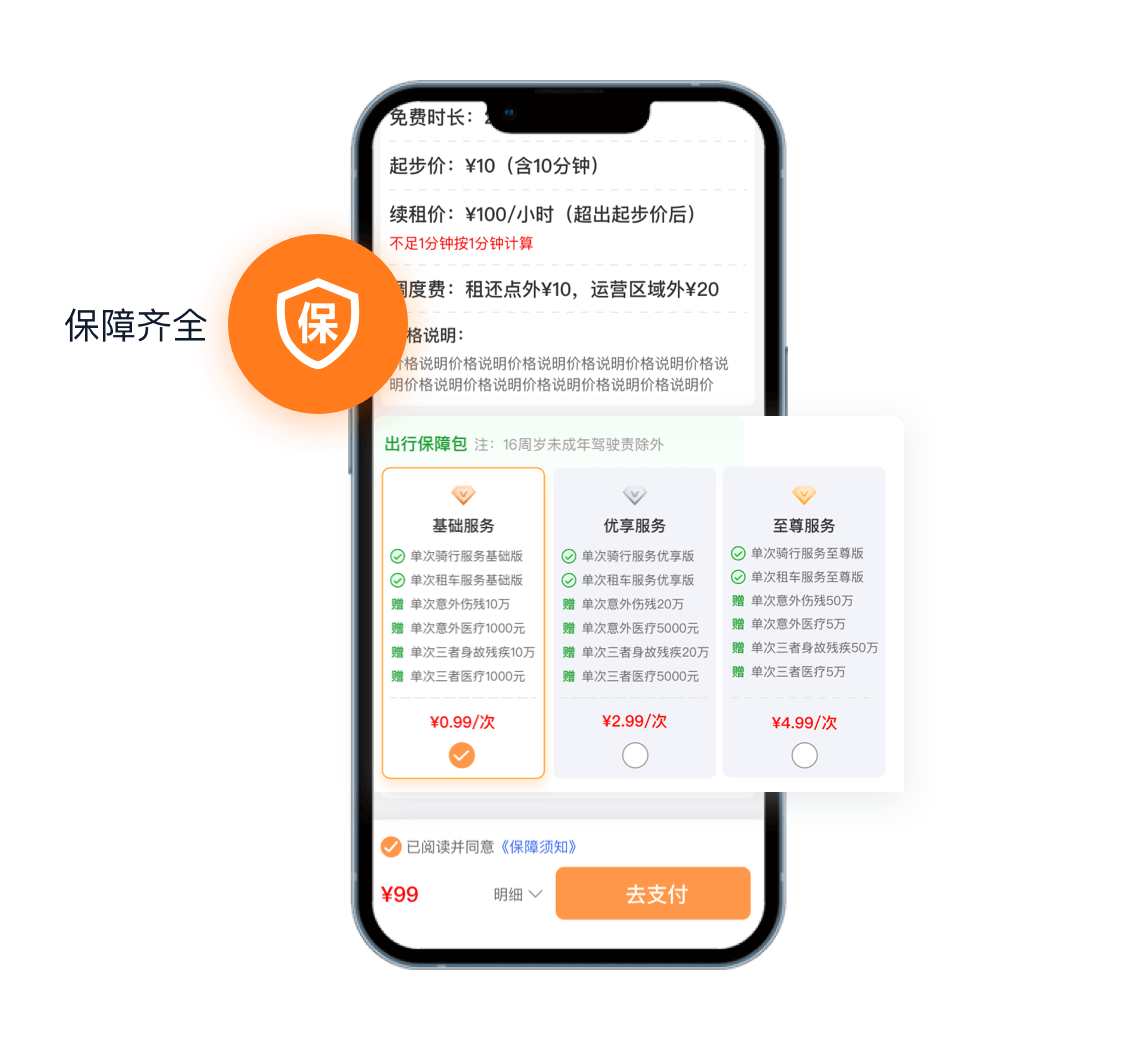 客户租赁可选骑行保障包,安全骑行意外可赔,车辆年险车损可赔。